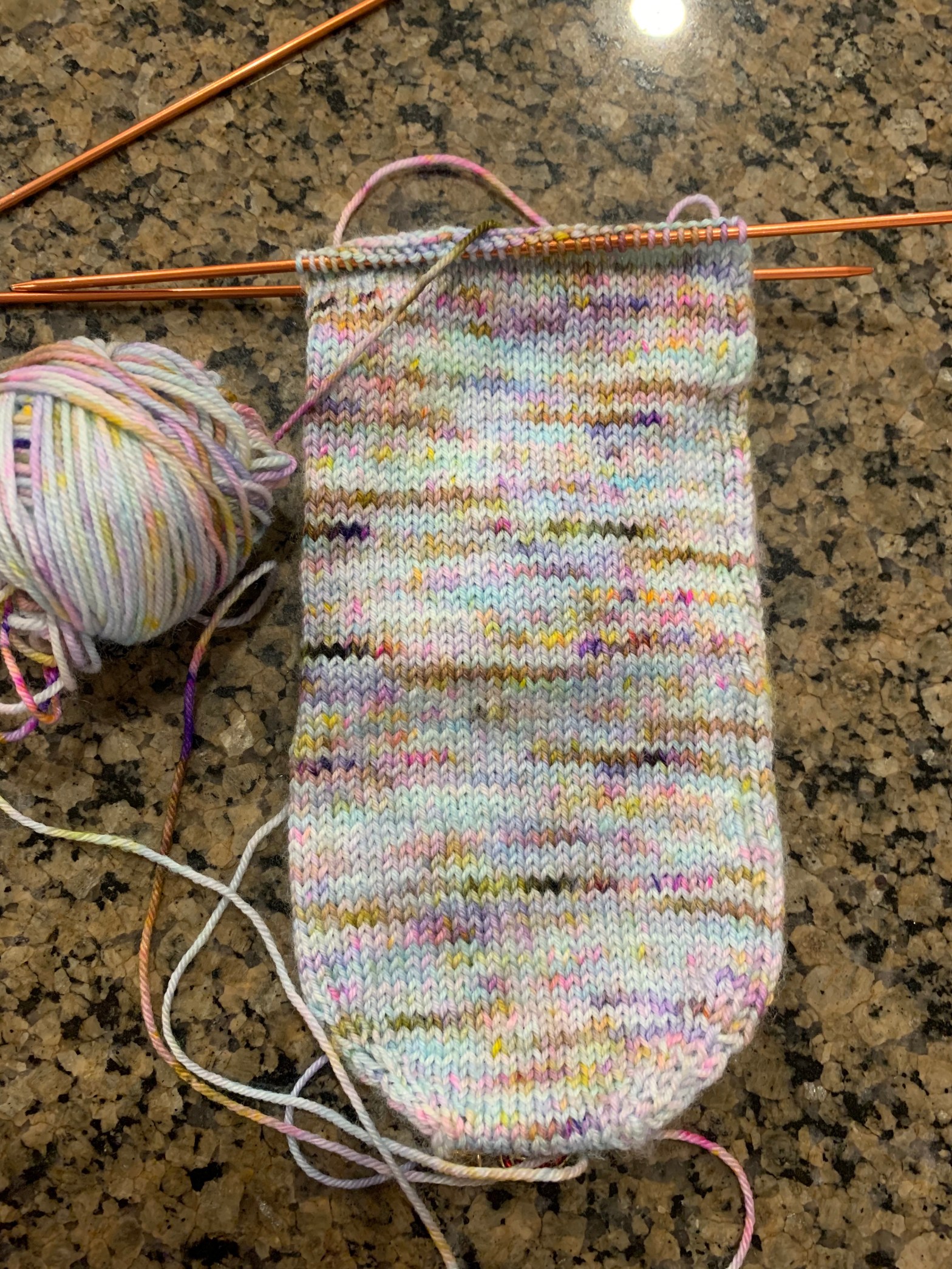When I was searching for the needles, I found a long-forgotten project with four needles attached. It was the cuff of a sock. I’d abandoned it 15 or more years ago, when the pattern told me to start the heel. I’d been too intimidated to continue.
