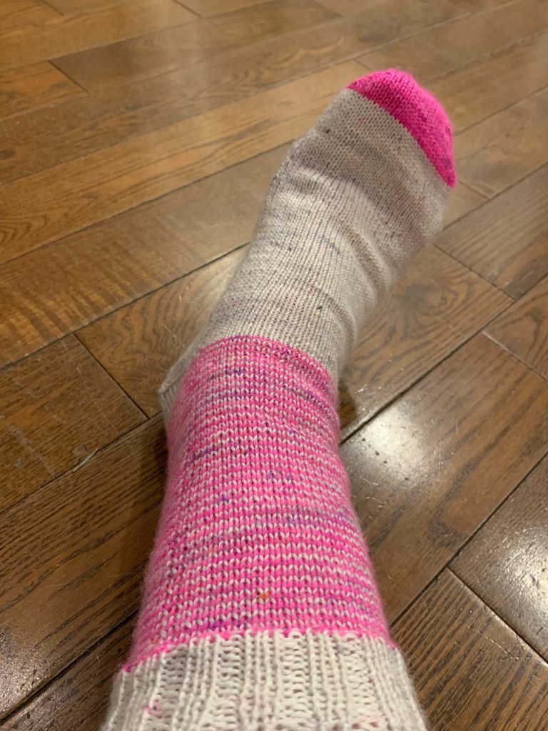 Permission to be a messy learner and to keep going even though it’s not completely correct is essential to growing new skills. After learning the basic skill set in the workshop, I armed myself with the written instructions and videos to make my first pair of socks. I surprised myself by how rewarding it was to put my first finished sock on my foot!